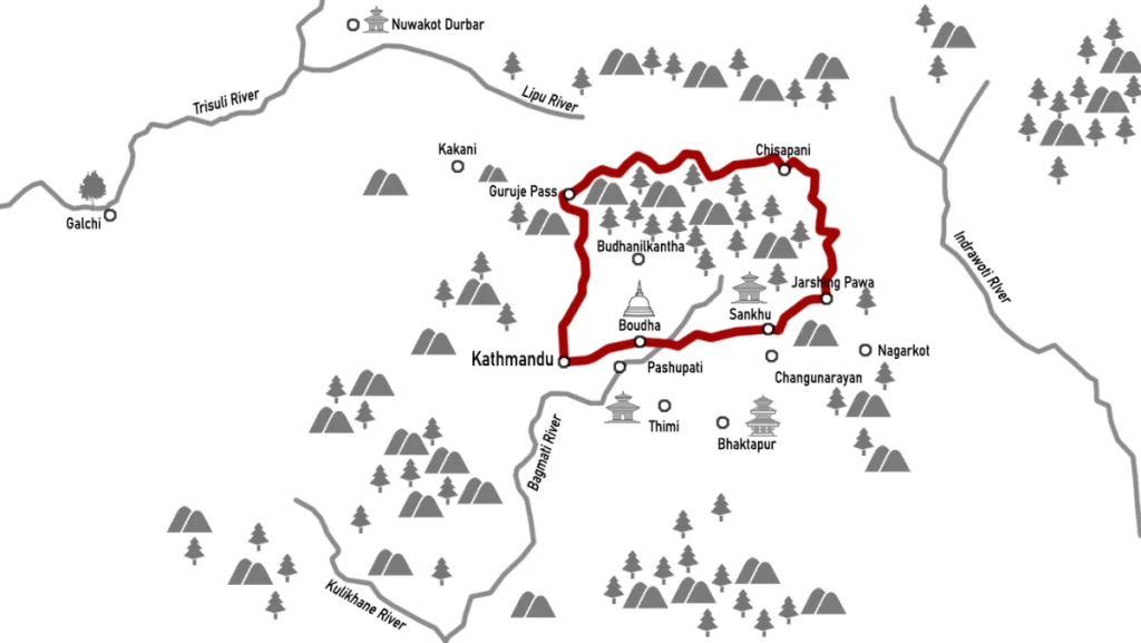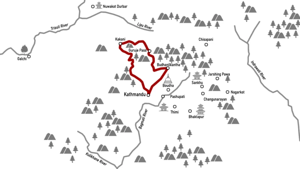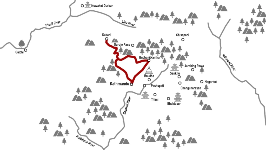 Grab some fresh mountain air on this trip along the top of the Kathmandu basin taking mainly paved roads. Kakani is a town 24 km to the north west of Kathmandu on the valley rim which sits at 2070 meters. There are stunning views from here of many Himalayan peaks: Gosaikunda, Langtang Himal, Ganesh Himal, Manaslu Himal, Annapurna Himal and Rolwaling Himal can all be seen from this spot on a clear day. The village of Kakani is famous for strawberry and white radish farming and alongside the many cold streams flowing down the hill are local trout farmers. We then ride on the back road to Budhanilkanta temple to see the sleeping Vishnu. Then back to Kathmandu.