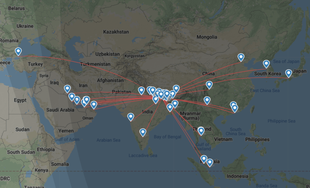 Kathmandu Tribhuvan International Airport has many flight routes in and out of Nepal. Please see the map for your closest connection. Currently Kathmandu is the only city in Nepal with an international airport. But this works perfectly fine as all of our Nepal tours start and end in Kathmandu.