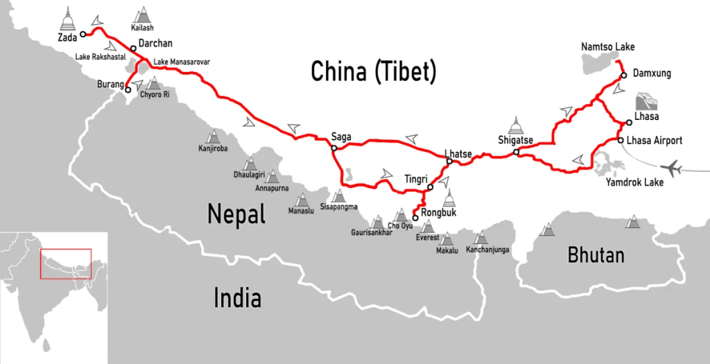 335 miles / 540 KM. This morning we will have the opportunity to witness the sunrise over Lake Manasarovar, where Mt. Kailash stands directly ahead of us. Riding back to Saga, we retrace our original route. Overnight hotel accommodation in Saga.