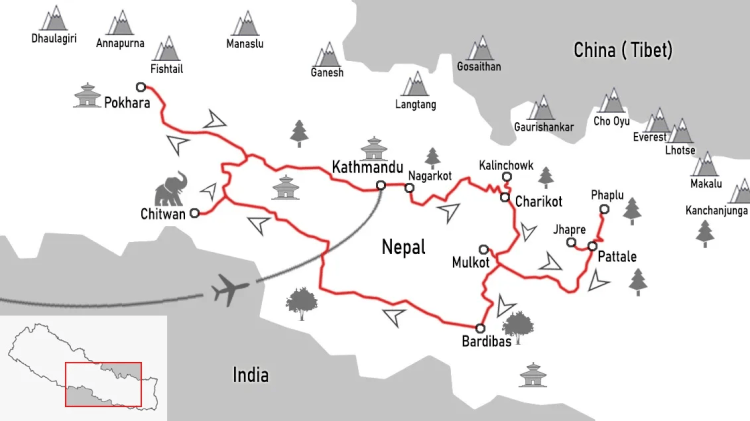 Complete a diverse circuit of Nepal featuring major tourist attractions and lesser known hilltop vantage points. On this trip you can see 9 of the 8000m+ peaks: Kanchenjunga, Makalu, Everest, Lhotse, Cho Oyu, Shishapangma,Manaslu, Annapurna and Dhaulagiri.