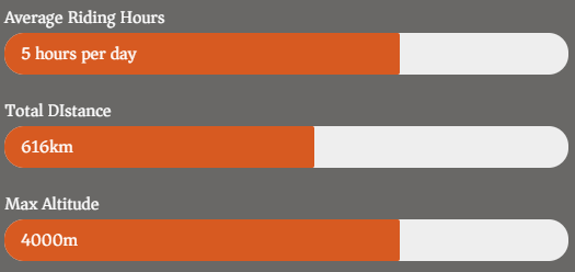 | Warm and sunny, with some chill factor on Days 4 & 5. Down jacket recommended for the evenings. Summer riding gear for daytime. |