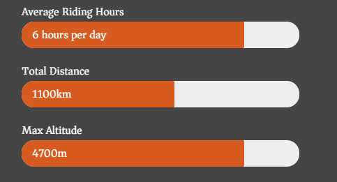 | Day 5 -10 you’ll be needing a down jacket in the evening for sure. The weather is warm and sunny in the daytime, however days 7-9 will also have some chill factor due to altitude whilst you’re riding so pack layers and winter riding gloves for this trip. For the majority of days summer riding gear is great – overall layers are key. |